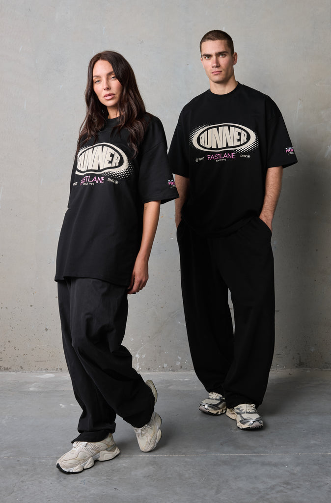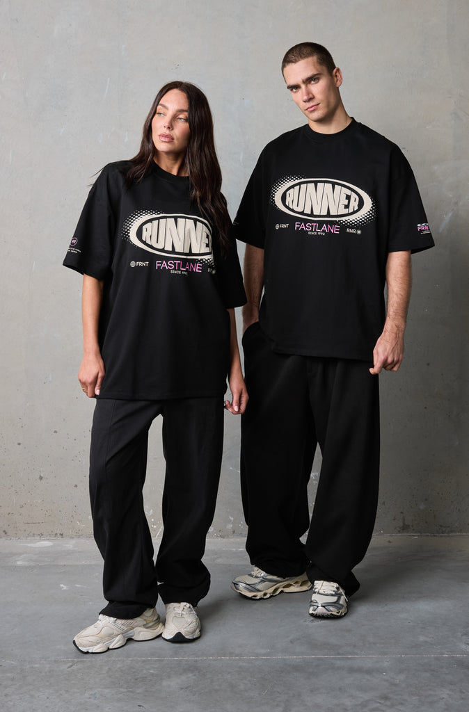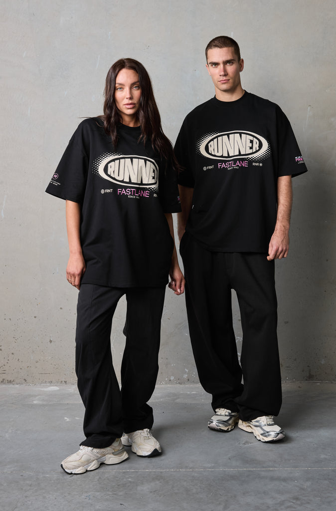 The Fast Lane Tee in Black pushes statement graphics into high gear. Built with Front Runner’s signature oversized boxy fit, this tee is designed to turn heads whether you’re on the move or posted on the street. Its bold design work makes it a standout piece in any rotation.