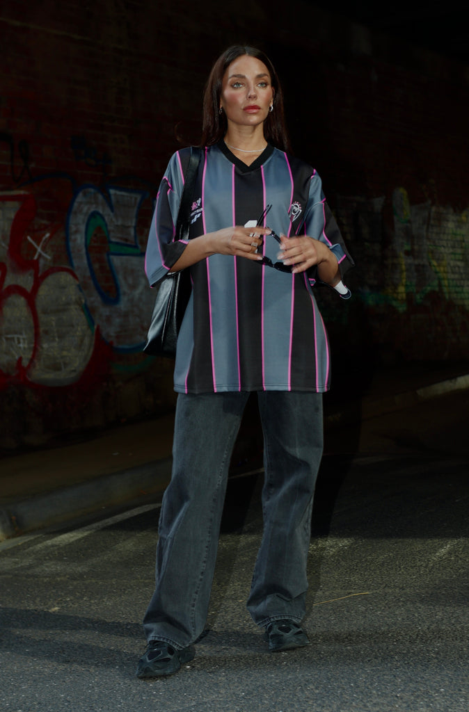 Retro sport energy meets modern streetwear. The Forward Jersey is cut from a lightweight, silky-soft fabric that drapes effortlessly over the body. Featuring an all-over vertical stripe print, ribbed V-neck, and premium embroidered logos, this piece is made to move with you—on or off the field. It’s bold, breathable, and designed to stand out.