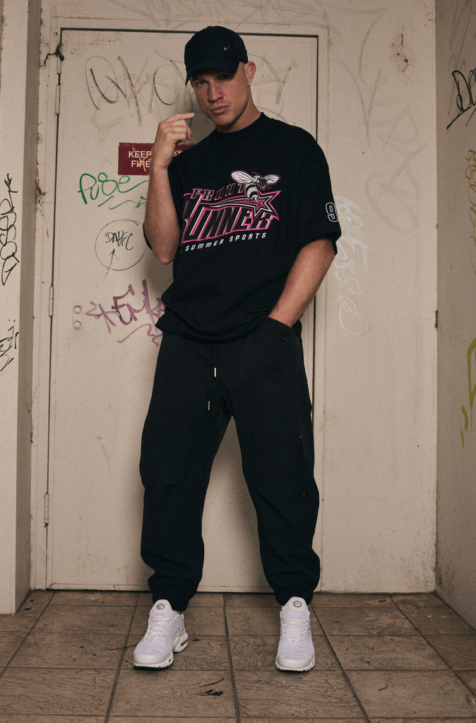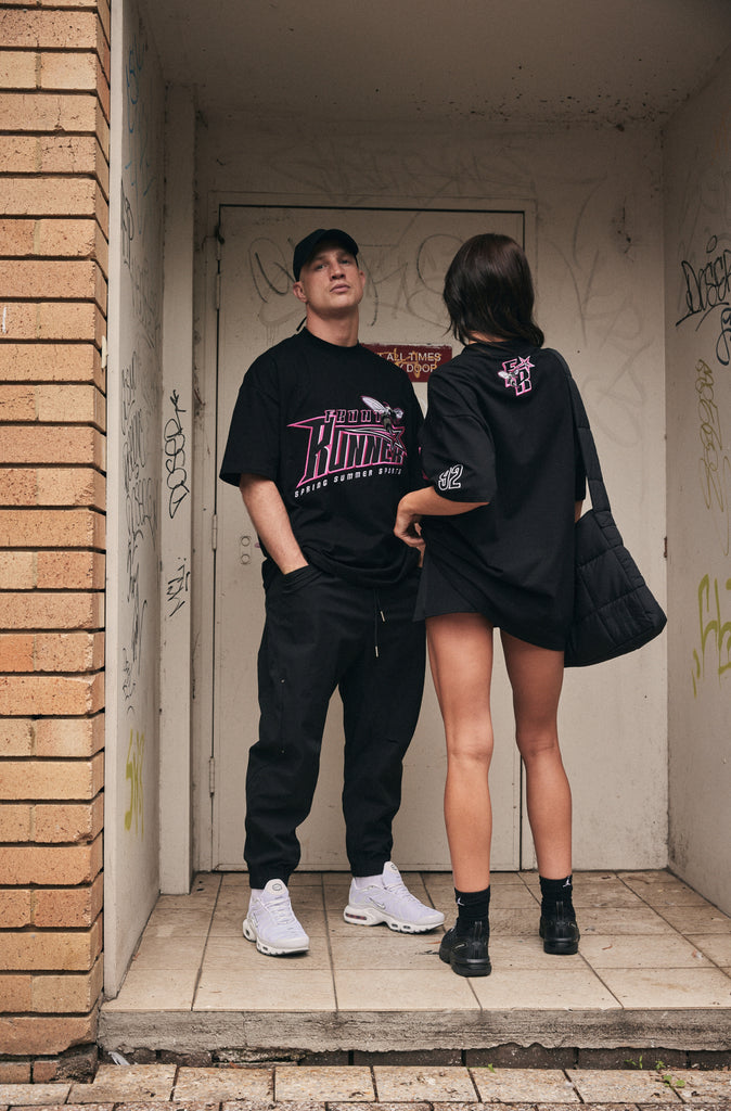 Catch our Hornet Tee while you can. This tee combines your favourite bold Front Runner graphics with a sting of bright pink on black, in our classic oversized fit in medium weight terry fabric.