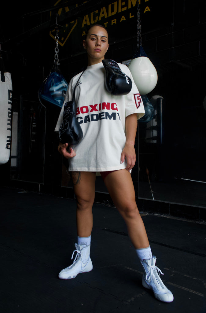 The Boxing Academy Tee in Vanilla brings a clean base with bold, punchy detailing—made to turn heads in and out of the ring.